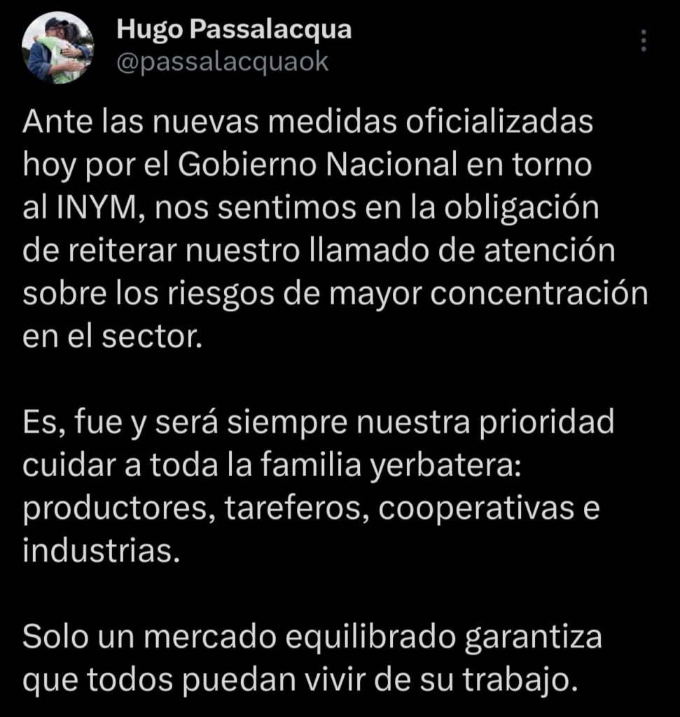 MARTES 18 DE ENERO DE 2025. El gobernador Hugo Passalacqua utilizó sus redes sociales para manifestarse “ante las nuevas medidas oficializadas hoy por el Gobierno Nacional en torno al INYM, nos sentimos en la obligación de reiterar nuestro llamado de atención sobre los riesgos de mayor concentración en el sector”. Ante tal panorama, afirmó que “es, fue y será siempre nuestra prioridad cuidar a toda la familia yerbatera: productores, tareferos, cooperativas e industrias. Solo un mercado equilibrado garantiza que todos puedan vivir de su trabajo”.