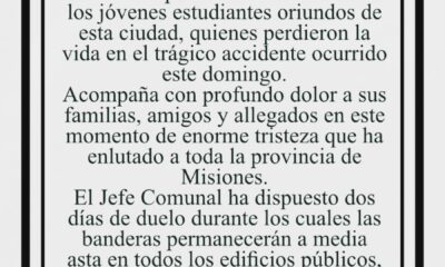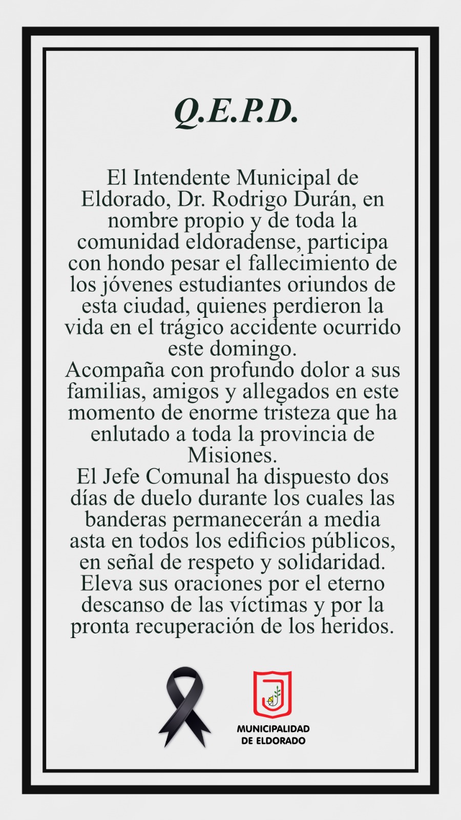 El Intendente Municipal de Eldorado, Dr. Rodrigo Durán, en nombre propio y de toda la comunidad eldoradense, participa con hondo pesar el fallecimiento de los jóvenes estudiantes oriundos de esta ciudad, quienes perdieron la vida en el trágico accidente ocurrido este domingo.