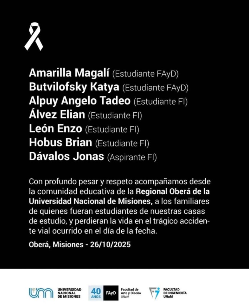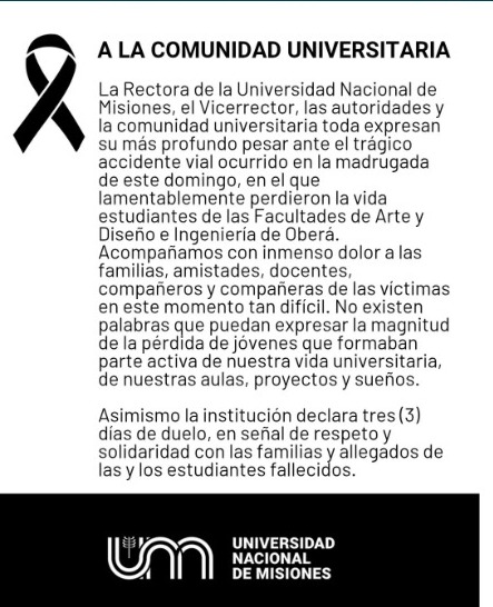 Desde las Facultades de Arte y Diseño y de Ingeniería de la UniversidadNacional de Misiones emitieron un comunicado en el cual expresaron sus condolencias a las familias de los fallecidos en el accidente ocurrido esta madrugada en la Ruta Nacional 14, en Campo Viera.