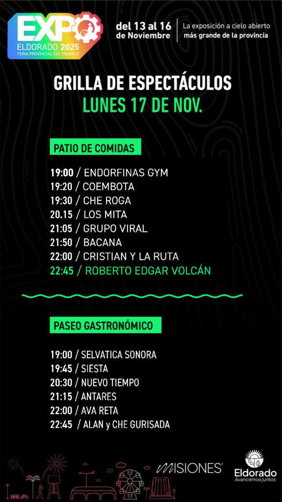 Cabe mencionar que, después de dialogar y consensuar con los expositores, se informa que la Expo Eldorado continuará con sus actividades hoy, lunes, desde las 18 horas.