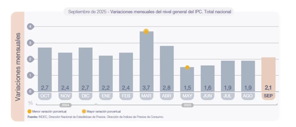 El Instituto Nacional de Estadística y Censos (INDEC) informó este martes que la inflación de septiembre de 2025 fue del 2,1%.