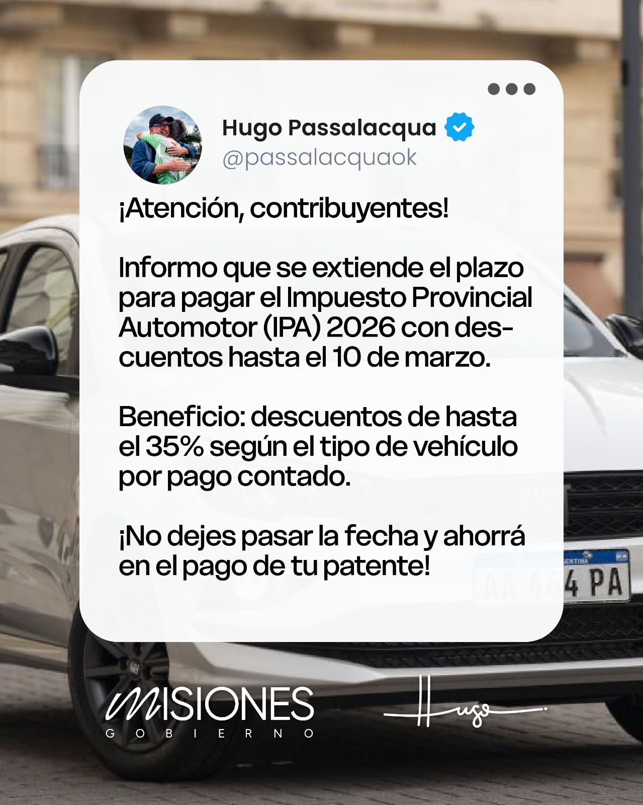 POSADAS, MARTES 10 DE FEBRERO DE 2026 – El gobernador de Misiones, Hugo Passalacqua, anunció a través de sus redes sociales la prórroga del plazo para abonar el Impuesto Provincial Automotor (IPA) 2026 con importantes beneficios. La nueva fecha límite será el 10 de marzo, manteniéndose los descuentos de hasta el 35% por pago contado, según el tipo de vehículo.