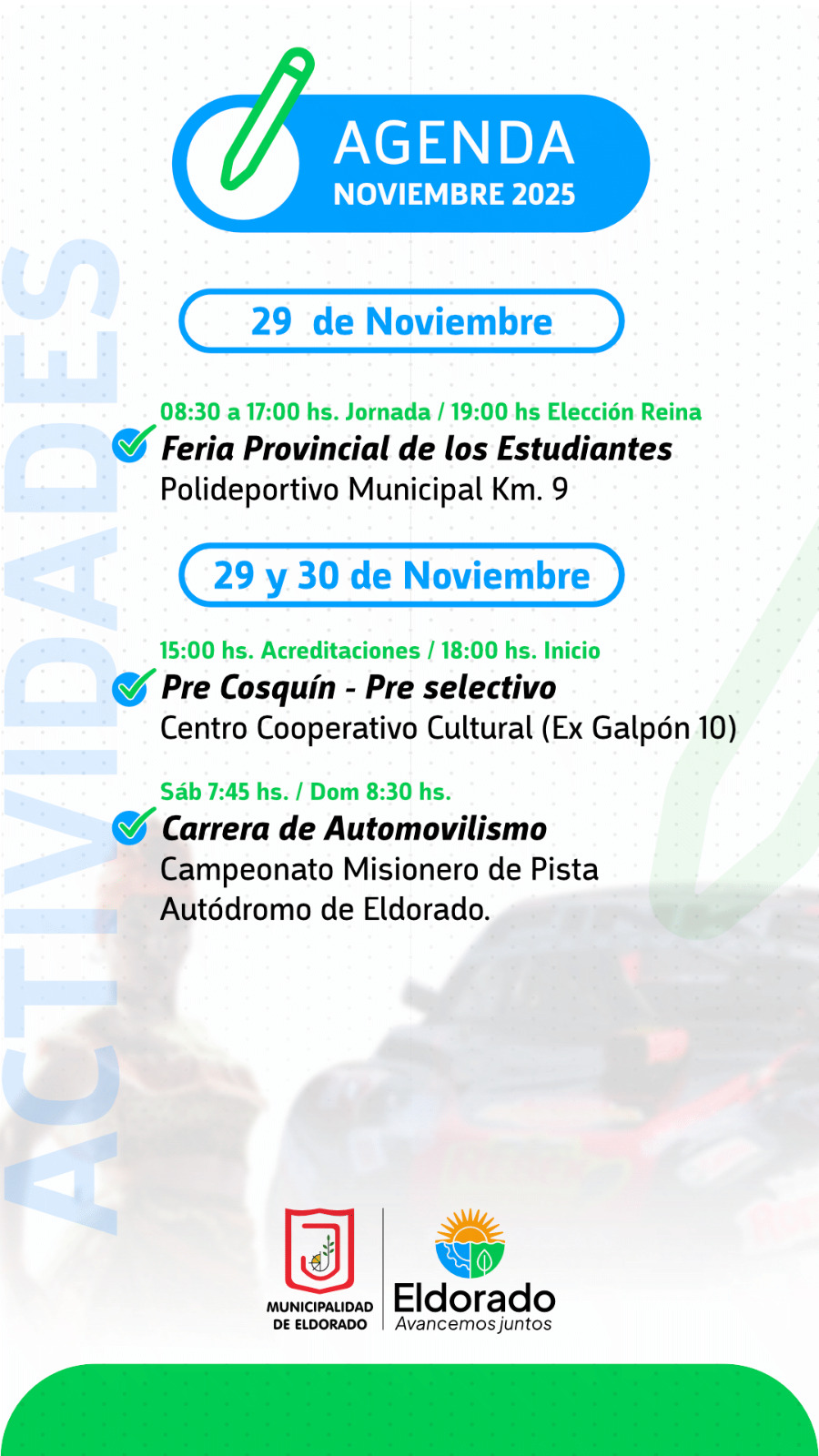 En tanto que el sábado se llevará adelante la Fiesta Provincial de los Estudiantes que, por primera vez, se hará en Eldorado y reunirá a aproximadamente mil jóvenes en el Polideportivo Municipal “Héctor H. Ligorria”. El cronograma es el siguiente: