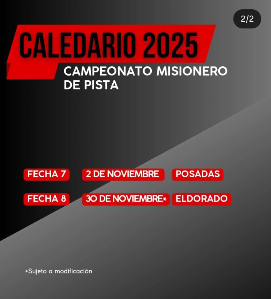 La Federación Misionera de Automovilismo Deportivo tras una reunión con la AMPPAC y los Delegados de todas las categorías de la FeMAD, de manera consensuada con los pilotos también, se modificó los escenarios de las dos últimas fechas del campeonato 2025 del Misionero de Pistas, así la séptima se correrá en Posadas y el Gran Premio Coronación será en Eldorado el 30 de noviembre.
