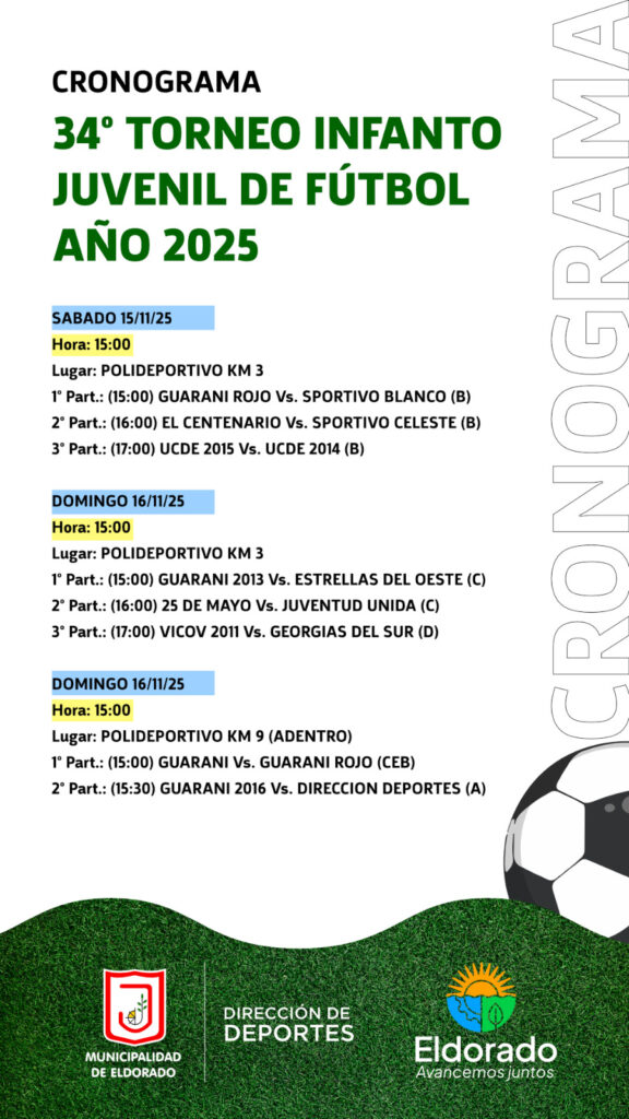 La nueva jornada del Torneo Infanto Juvenil de Fútbol de Eldorado en su 34° edición abre la fecha con tres partidos de la Categoría B en la cancha externa del Polideportivo Municipal y Universitario del km 3, mientras que mañana en el mismo escenario juegan la C y uno encuentro de la D. Todo arranca a las 15 horas.