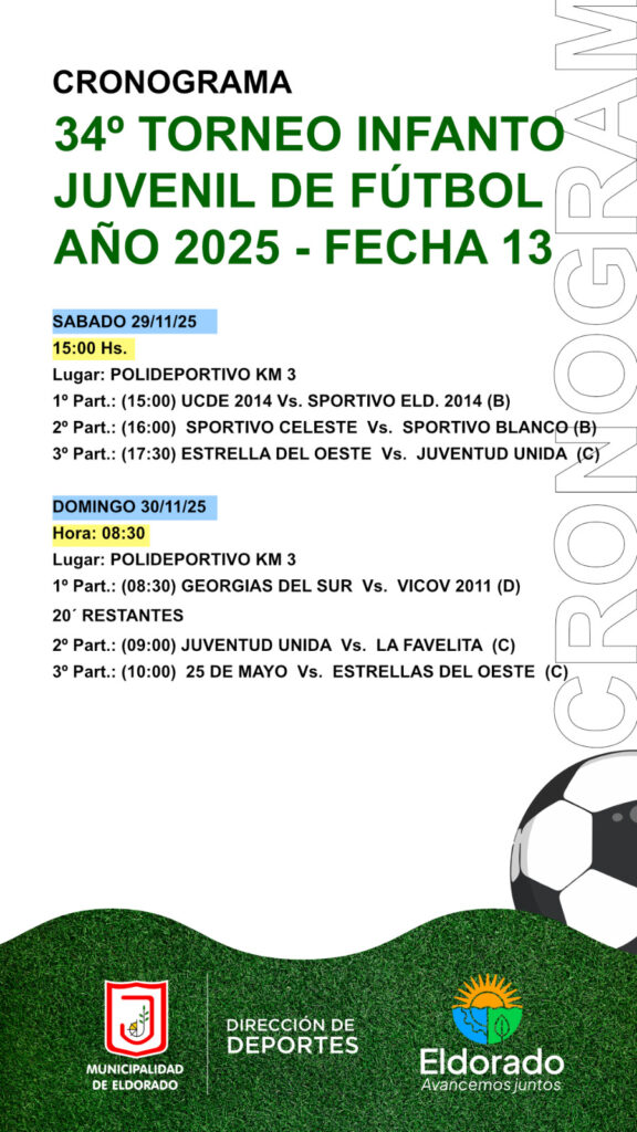 La fecha 13 del Campeonato Infanto Juvenil de Fútbol tiene acción sábado por la tarde y el domingo por la mañana en la cancha externa del Polideportivo Municipal y Universitario del km 3.