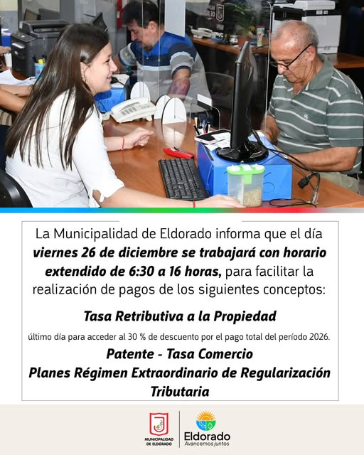 La Municipalidad de Eldorado informa que el día viernes 26 de diciembre se trabajará con horario extendido de 6.30 a 16 horas, con el objetivo de facilitar el pago de los siguientes conceptos: