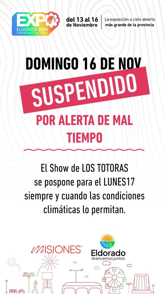 Expo Eldorado: Ante el pronóstico de lluvias, suspenden las actividades