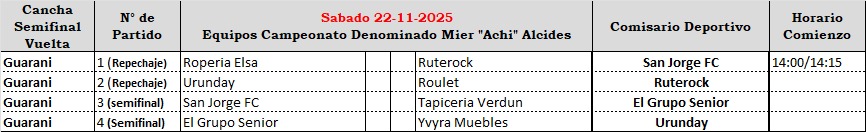La Liga Amateur de Fútbol Senior Eldorado desarrollará toda la jornada de este sábado en la cancha del Club Guaraní, primero se juegan las semifinales de la ronda repechaje y luego será el turno de los partidos revanchas de la semi para buscar los finalistas.El primer juego va desde las 14 horas y desde ese momento no se para hasta tener a todos los finalistas.