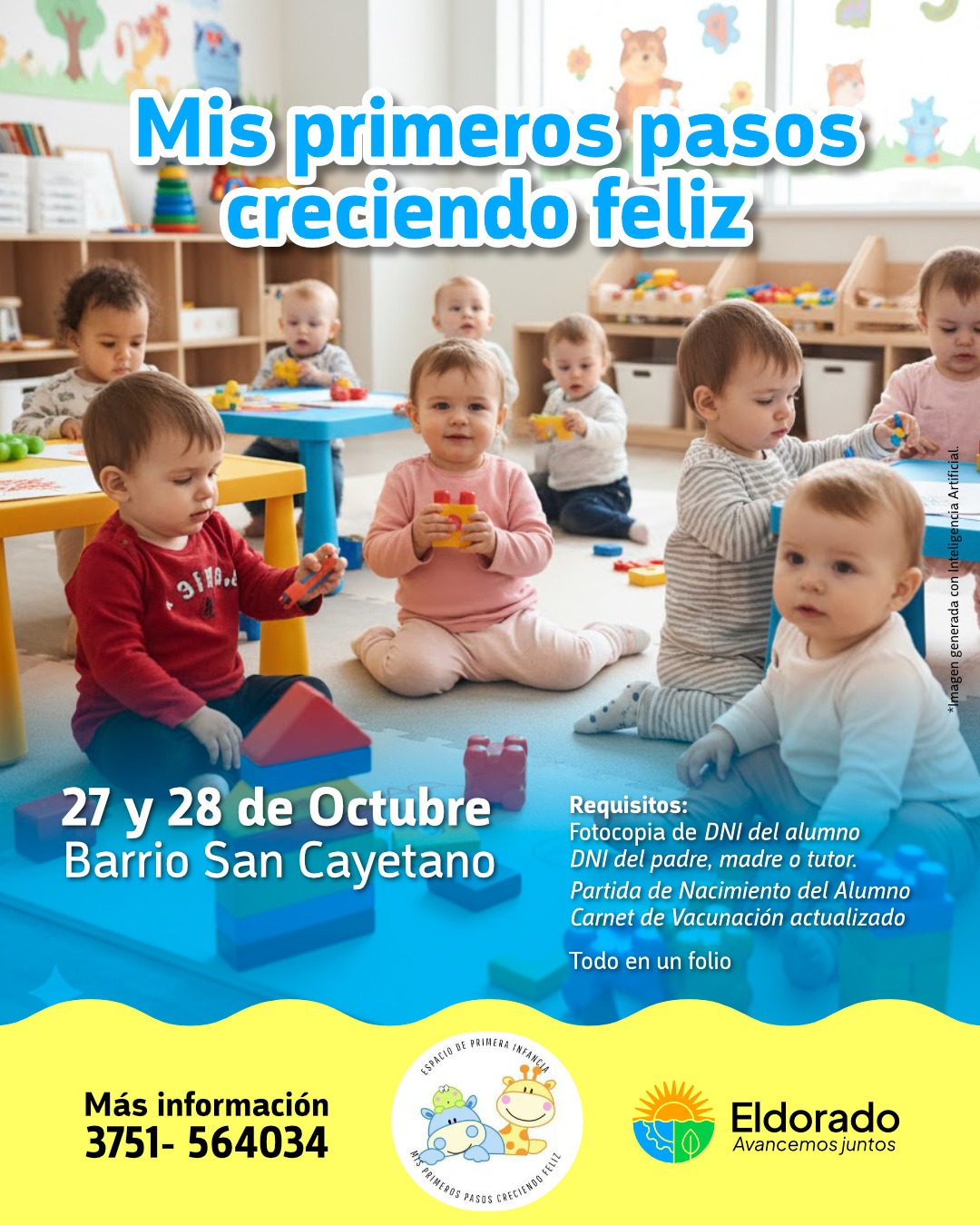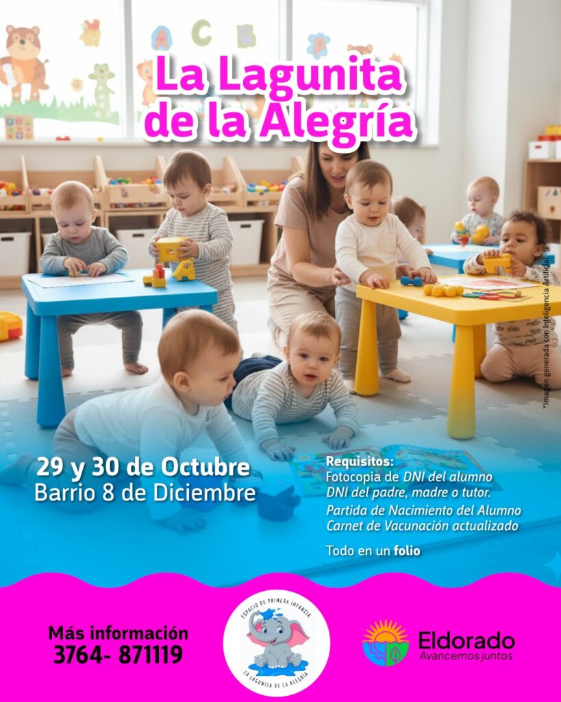 Esta semana se estará realizando la inscripción a los Espacios de Primara Infancia de la ciudad de Eldorado, el martes 28 de octubre se realizarán las inscripciones en el Barrio San Cayetano, en el Espacio “Mis Primeros Pasos, Creciendo Feliz”. Mientras que los días 29 y 30 de octubre se realizarán las inscripciones en el Barrio 8 de Diciembre, en el Espacio “La Lagunita de la Alegría”.