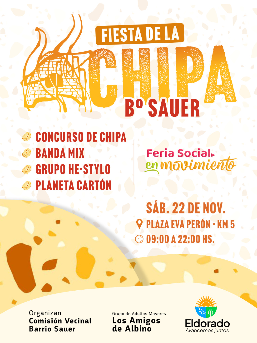 Este sábado 22 de noviembre desde las 9 a 22 horass, en la Plaza Eva Perón (Km. 5) se realizará una nueva jornada llena de sabores y tradición con la fiesta de la Chipa y la Feria Social en Movimiento, que contará con la presencia de emprendedores y feriantes de la ciudad.