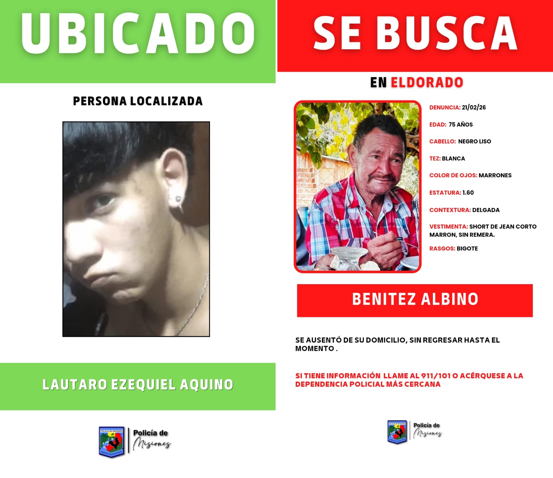 La Policía de Misiones ha emitido una alerta para localizar a Aquino Lautaro Ezequiel, un adolescente de 15 años que se ausentó de su domicilio en el Barrio San Onofre, en la ciudad de Eldorado, y no ha regresado hasta el momento. La denuncia fue radicada este 21 de febrero de 2026.