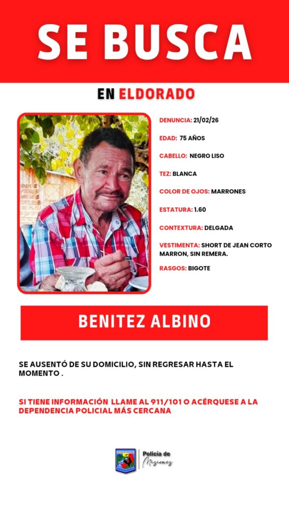 La Policía de Misiones ha emitido una solicitud urgente de colaboración a la comunidad para localizar a Bernabet Alcides Acosta, un hombre de 55 años que falta de su hogar en la ciudad de Eldorado. La denuncia formal por su desaparición fue radicada el 20 de febrero de 2026.
