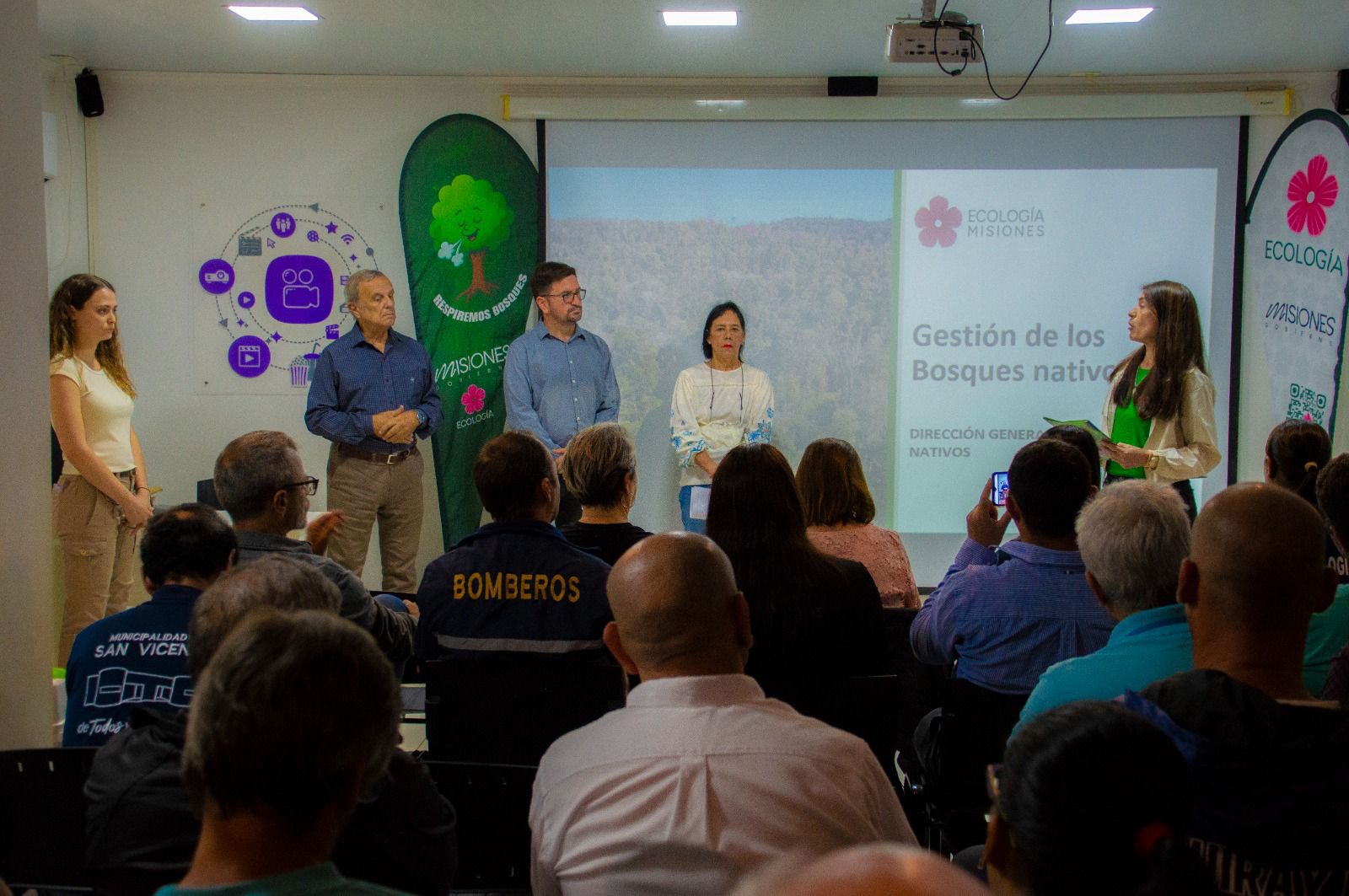 La capacitación contó con exposiciones del Ing. Mateo Sosa, director de Control Forestal, y Luis Chemes, director de Manejo del Fuego, además del acompañamiento del equipo de Educación Ambiental del Ministerio de Ecología. El encuentro reunió a representantes de predios privados con bosques nativos, aserraderos, industrias del sector maderero, autoridades municipales, Policía de Misiones, Bomberos Voluntarios, comunidades originarias y agentes de la Delegación de Bosques de San Vicente.
