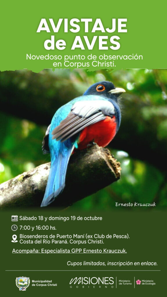 Este sábado 18 y domingo 19 de octubre, se realizará una nueva jornada de observación de aves, organizada por la Municipalidad de Corpus Christi, con el acompañamiento del Ministerio de Turismo de Misiones.