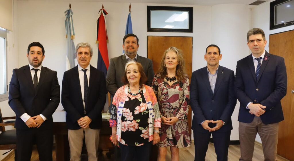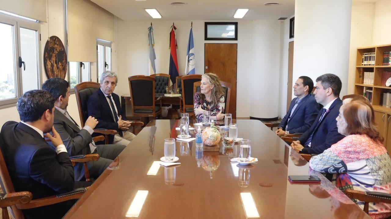 La presidente del Superior Tribunal de Justicia, Rosanna Pía Venchiarutti Sartori, junto a los ministros Cristian Marcelo Benítez, Froilán Zarza, Juan Manuel Díaz, Ramona Beatriz Velázquez y el Procurador General de la Provincia, Carlos Jorge Giménez, recibió en el Salón de Acuerdos a Aníbal Edgardo Areco, médico especialista en Psiquiatría del Cuerpo Médico Forense de la Corte Suprema de la Nación.