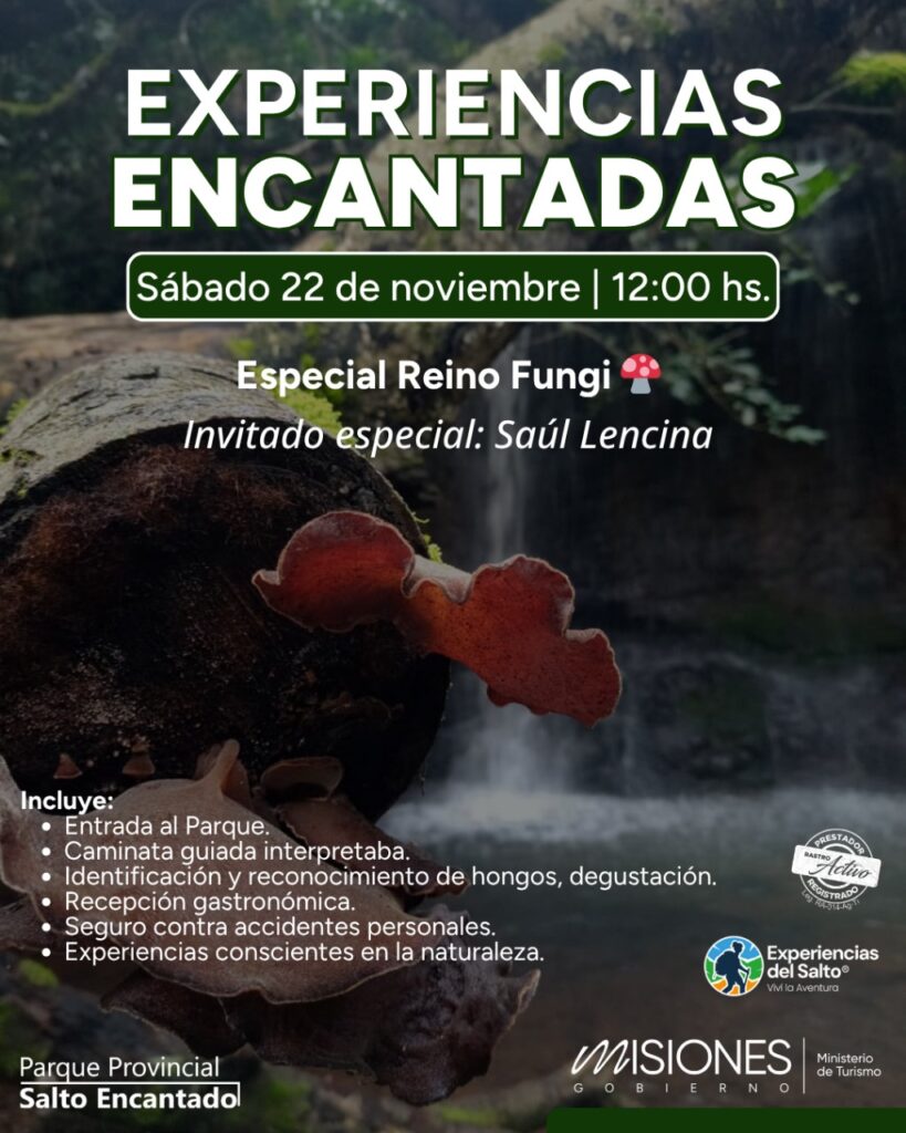 Una semana después, el sábado 22 de noviembre, de 12:00 a 18:00 hs, llegará una edición especial: “Experiencias Encantadas – Reino Fungi”, una jornada dedicada al fascinante mundo de los hongos de Misiones y su valor ecológico y gastronómico.